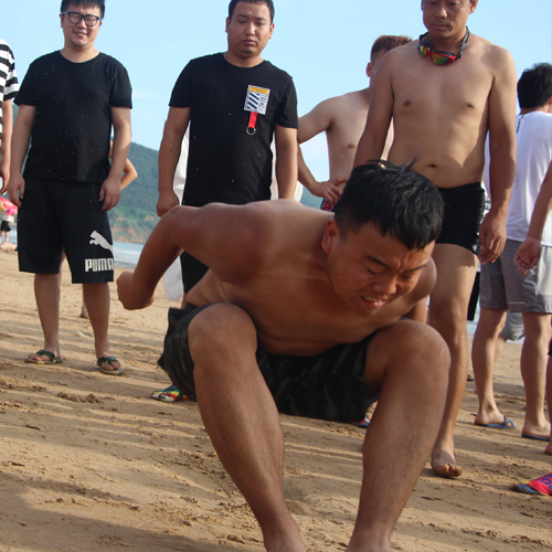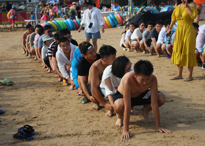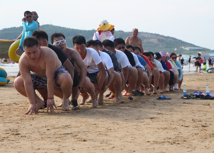 最后,是整個團隊所有人必須全力配合的“蜈蚣漫步”,小組成員排成一列,后面的小伙伴雙手握住前面人的腳踝,采取蹲行的方式向前移動,哪一組先到達終點,就取得了勝利。