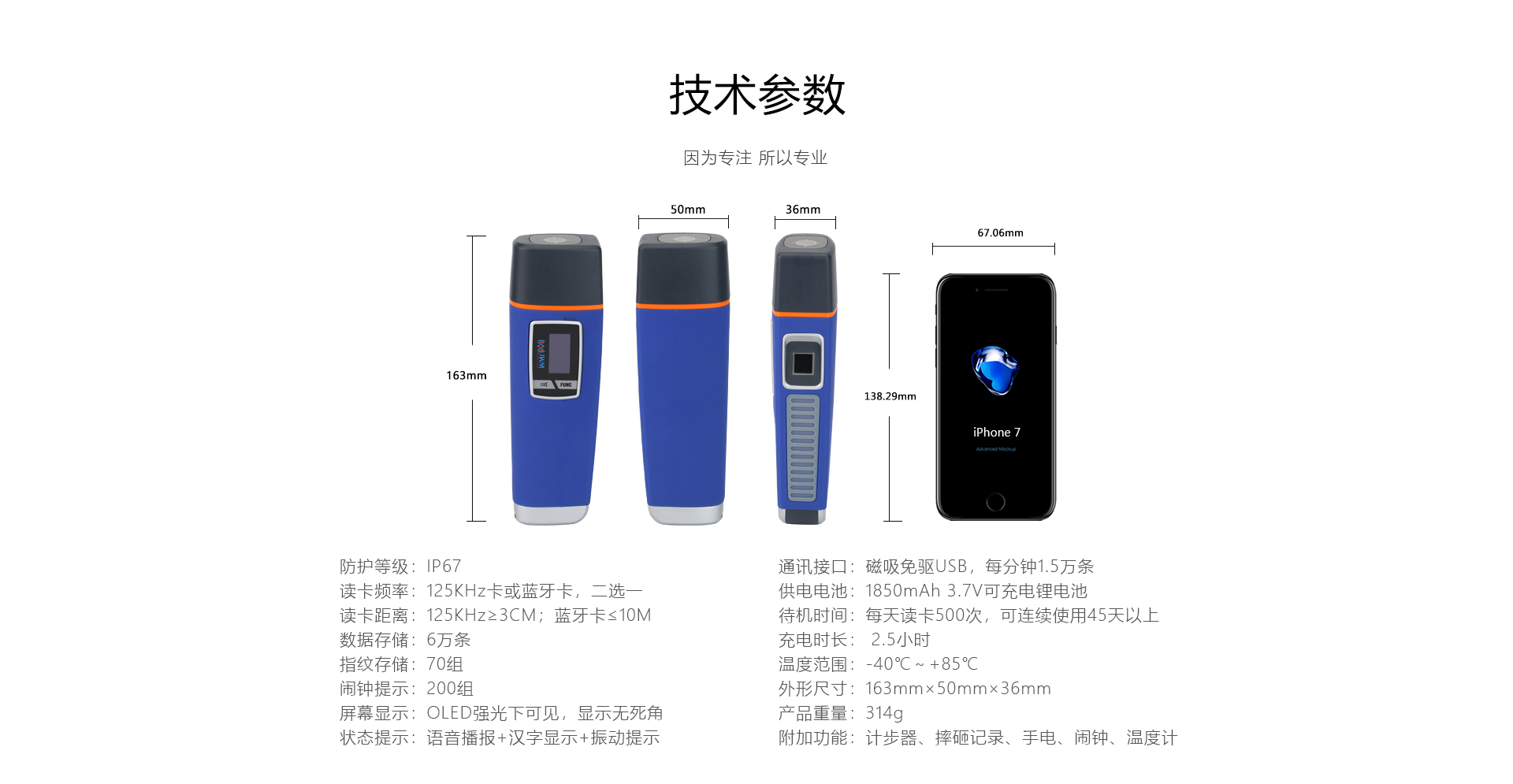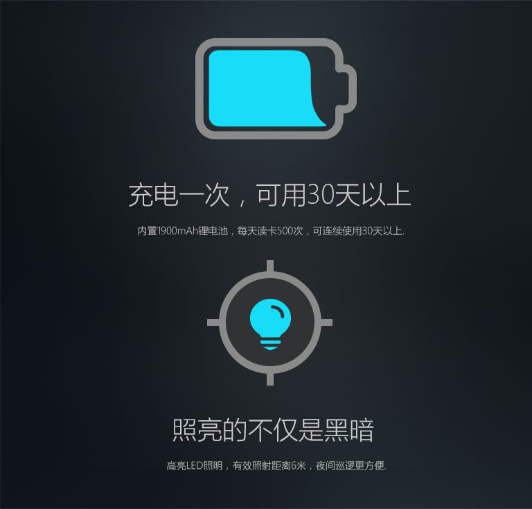 內置1850mAh鋰電池,每天讀卡500次,可連續使用45天以上.