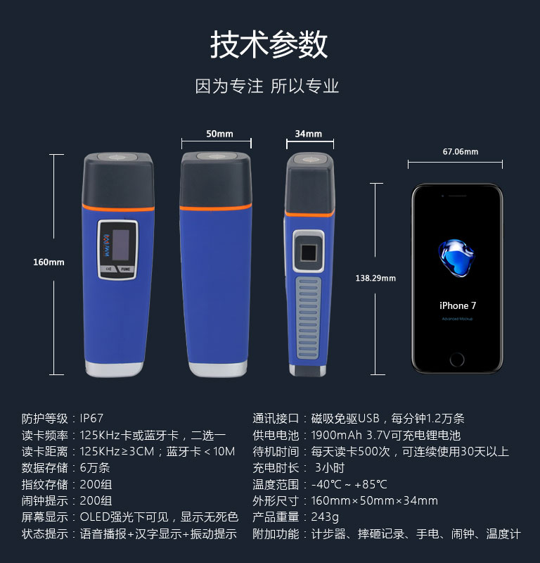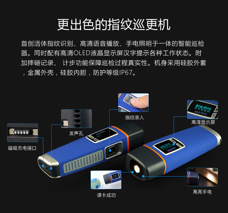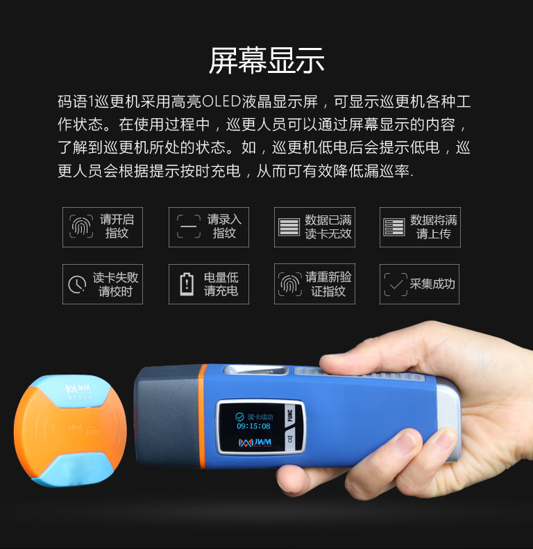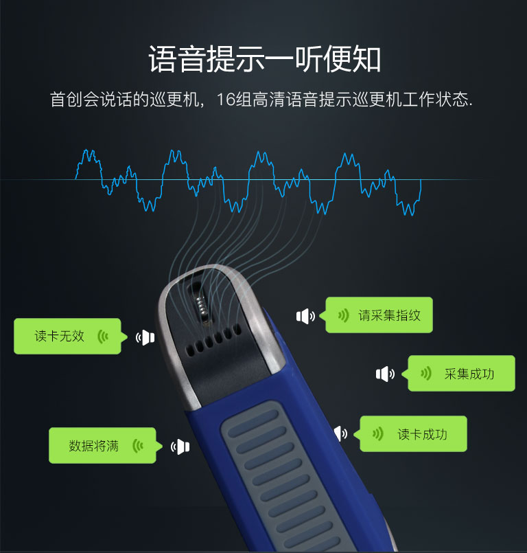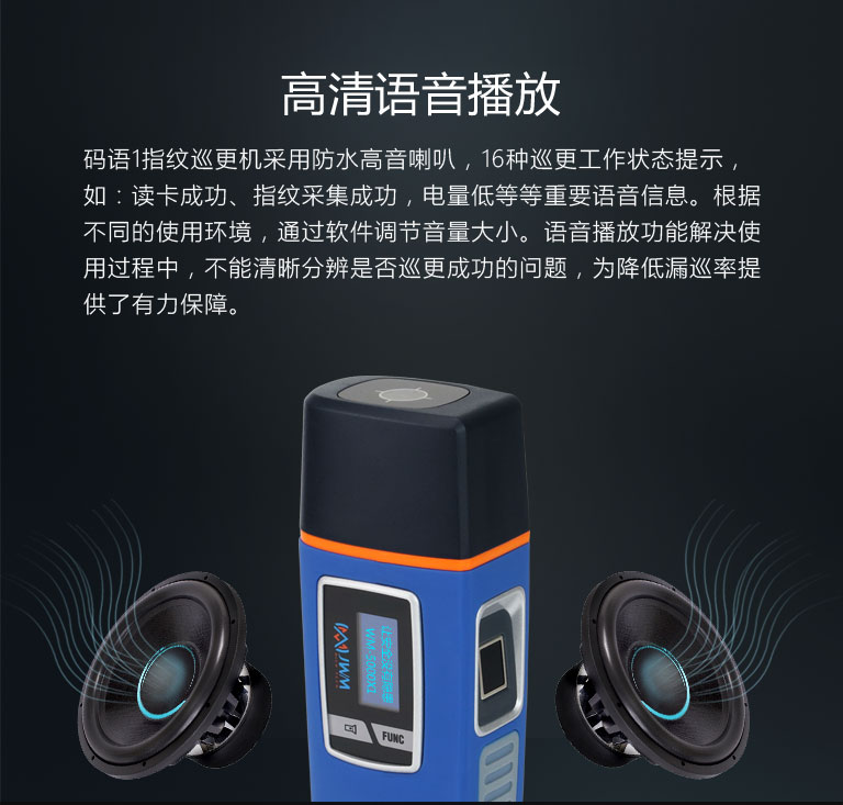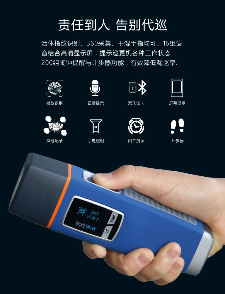 活體指紋識別、360采集、干濕手指均可。16組語音結合高清顯示屏,提示巡更機各種工作狀態。200組鬧鐘提醒與計步器功能,有效降低漏巡率。